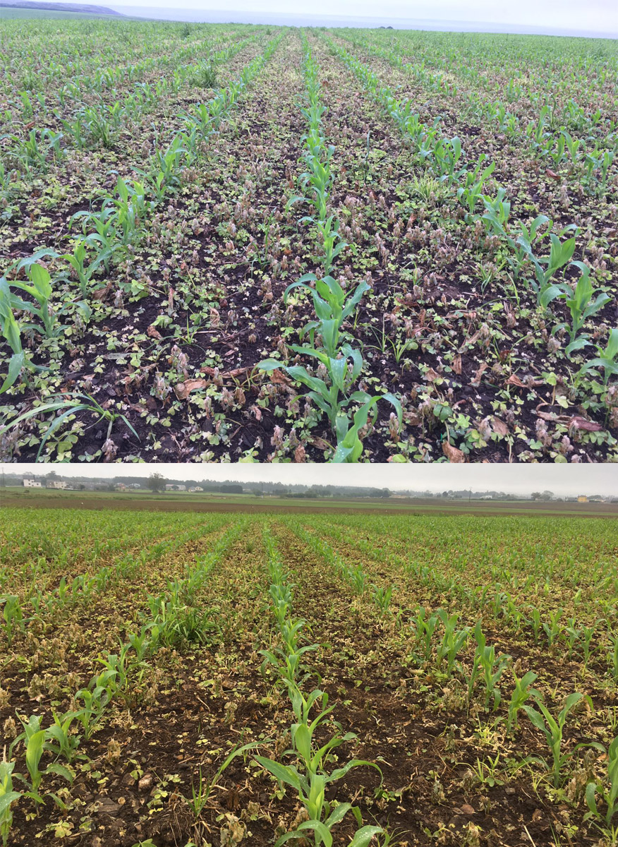 Solución herbicida que combina dos materias activas complementarias para el control de malas hierbas gramíneas y dicotiledóneas en el cultivo del maíz en pre y/o post emergencia precoz.