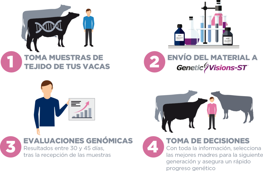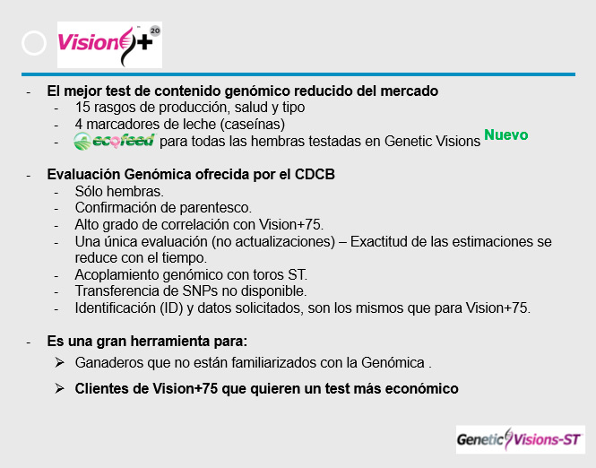 Realizamos los test genómicos, con la más alta fiabilidad, a través del laboratorio Genetic Vision-ST (USA), propiedad de ST genetics, que además, se ocupa de realizar el envío de los resultados al CDCB, (organismo oficial en USA para evaluaciones genéticas), para su valoración en TPI.