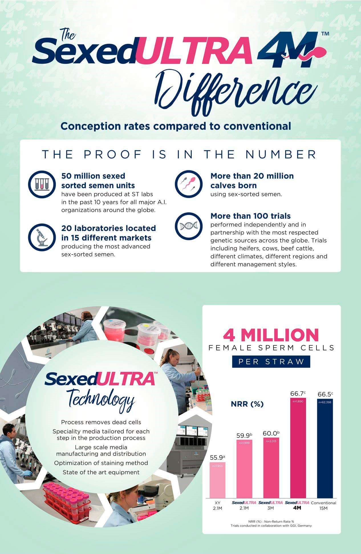 Tras muchos años de investigación, ST genetics ha ido perfeccionando la tecnología del sexado del semen hasta poder ofrecer el prestigioso producto SexedULTRA 4M, con 4 millones de espermatozoides vivos de altísima calidad, por dosis. Con 100 millones de partos en los 10 últimos años, y 31 millones de dosis de dosis producidas en los 2 últimos años, la calidad de este producto está más que contrastada a nivel mundial.